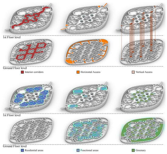 - Functional areas located at an inverse-proximity order to the entrance gates (with airlocks, quarantine, and medical units closest to the gates, whereas leisure and private segments are located further from it).