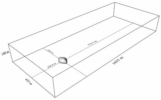 As the convention dictates, 1D blockage ratios of less than 17% in the vertical and spanwise direction of the case geometry inside the rectangular domain will result in an overall blockage ratio of less than 3% []. The same values have been chosen for this study, which have resulted in the domain dimensions shown in Figure 4. It should be mentioned that the streamwise depth of the domain and the position of the case with respect to the inlet of the domain have been calculated through previous wake sensitivity analyses in similar building exterior flow field studies [,].