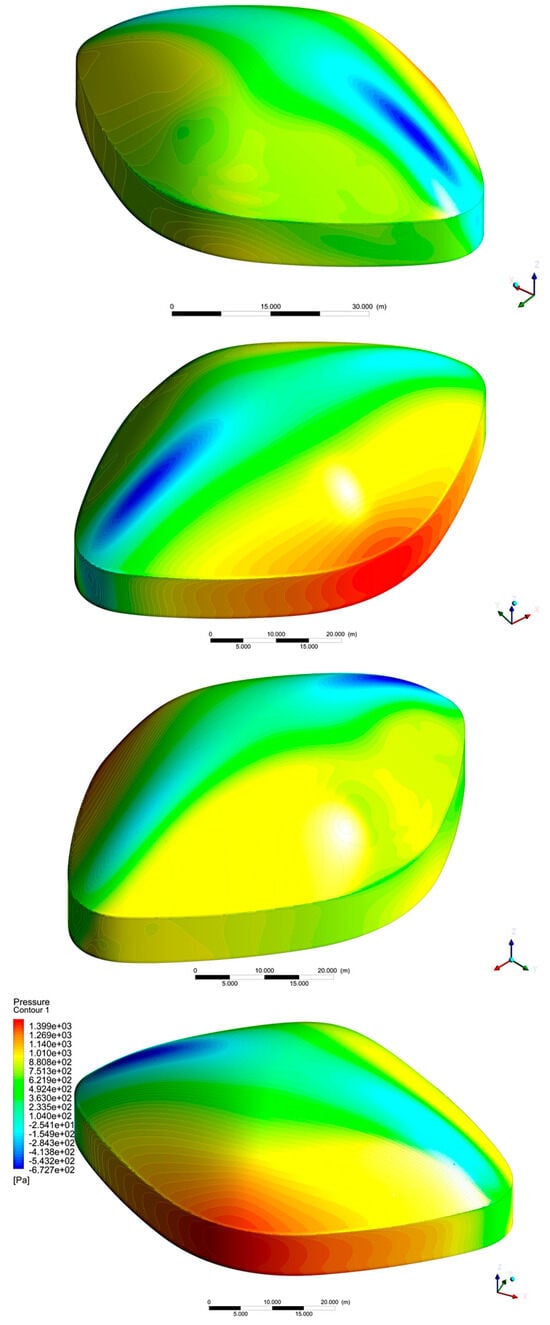 Multiple studies suggest the possibility of utilizing Martian atmosphere components as an input to the LSS to generate breathable oxygen for the habitat. Amini et al. [] also propose the idea of utilizing storm energy as a backup power generation source. However, the complex climate of Mars, its low atmospheric pressure, and atmospheric dynamics define an important challenge in constructing a long-term large habitat. As the habitable interior should maintain 1 atm bearable pressure, the structure must prevail over the lateral loads of the pressurized air pushing outward on the interior walls and leakage while also bearing the external wind loads. The construction process itself prior to human arrival can also be affected by winds [].