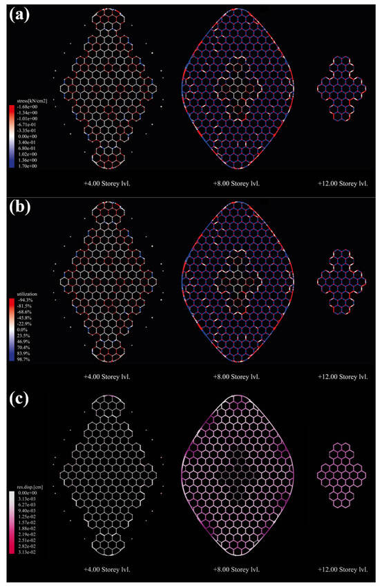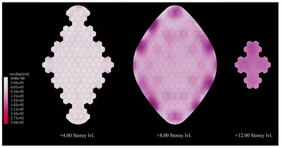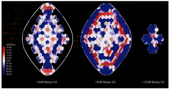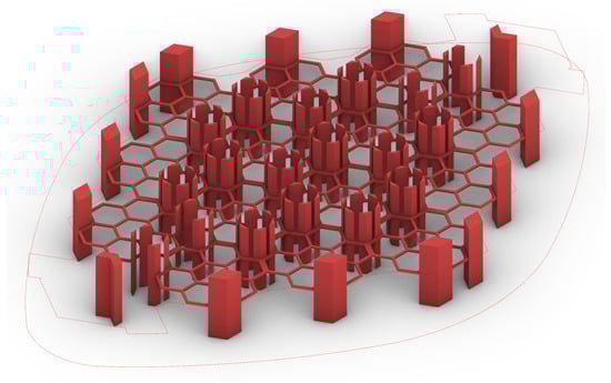 To have a better grasp of the geometry of the mentioned modular design, it could be noted that the largest layer of the hexagons, also denoted as the 4th layer, is the major block of the 6.49 m hexagonal pattern that sweeps the plan of the MHUs. There is a 3rd layer hexagon located in each main module concentrically; however, with a 30-degree rotation around its center, which results in the side length of 3.75 m. Placing seven second-layer hexagons inside the main module, with their sides parallel to the main module’s orientation, allows the side length to be 2.16 m. And continuing one step further with the same reverse growth rate, the first layer modules are obtained with a side length of 1.25 m. More details on the specifications of the hexagonal modules are to be found in [], Section 8.5. In light of the core scope of this manuscript, it should be noted that the architectural, structural, and system-level design of the components must obey the geometric juxtapositions enabled by this modular design.