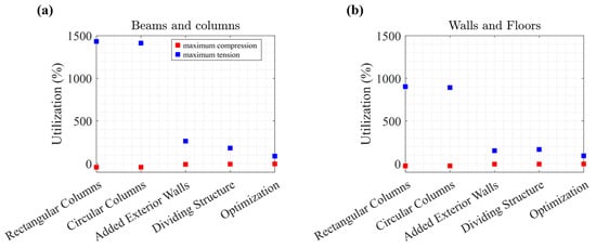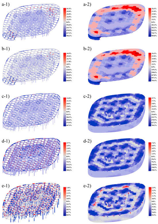 The enveloping garden (the term used from the original design presented by [], referring to the exterior garden area enveloping the interior of the MHUs) around the exteriors of the ground and first floors plays the role of an intermediate membrane. This intermediate level functions in many aspects, such as lighting (semi-natural lighting concept discussed in [], air pressure (the pressurized vessel concept discussed in [,], breathable atmosphere, etc. The interior of the MHUs is kept at the standard sea level (on Earth) atmospheric pressure, while the exterior of the units, i.e., the atmosphere of Mars, reaches pressures less than one percent of that. This gap, which is to be supported by the structure of the MHUs, is bridged through an intermediate medium, as discussed above, where the vegetation does not require more than 85% of the atmospheric pressure needed by the crew [,]. And since the presence of crew members in the garden is also intermittent and temporary, they will not be subject to any harm in that regard, either. This consideration, which eases the tension of inflation on each of the layers of the façade, as the gradual pressure differences are supposed to be addressed with lighter structural elements, has been named the “double-layered pressure vessel” throughout the documentation published on this research.