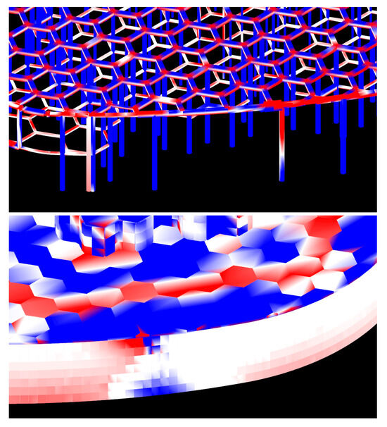 The entire unit interior and garden area are then extruded for two stories to build the ground and first floors as the main bulk of interior areas. The ground floor is considered to house the work areas, labs, medical and communication centers, service areas, lots for subsystems, electrical, and mechanical devices, while the first floor holds crew private residential suites. In the central, mostly 2 by 2, array of the main hexagonal modules on the second floor, a bunker is devised for extreme emergency cases, for when the crew needs shelter while waiting for the arrival of rescue teams. On the same level, i.e., the top of the first floor, where the exterior atmospheric conditions govern, a flexible, yet robust, membrane is extended all over the MHUs’ top side and is kept in a paraboloid geometry by hydraulic jacks, as well as being inflated by compressed Martian atmosphere from below, using a safe-fail redundant set of compressors. This anti-dust-settlement membrane, or ADSM for short, is capable of morphing to maintain different heights and serves as a flow-controlling technique to control the separation of the exterior flow field on the MHUs and reduce the amount of dust settlement on the central regions of the cluster, where the solar farm is located, in dust storm seasons. More information regarding the functionality and operation of the ADSMs, as well as their geometrical design, is presented in [].