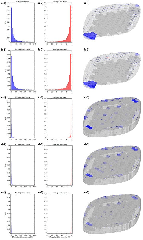 Despite the lack of accuracy, in order to proceed with the structural simulation of the proposed design, the materials and their available mechanical behaviors obtained from the specific studies, their specific test conditions, advantages, and disadvantages regarding ISRU and AM are presented in Appendix A. The processed regolith into cast and sintered basalt suggested in [], with 490 MPa compressive strength, 14 MPa tensile strength, and 73 GPa Young’s modulus, the chosen material as the software input for the structural analysis.