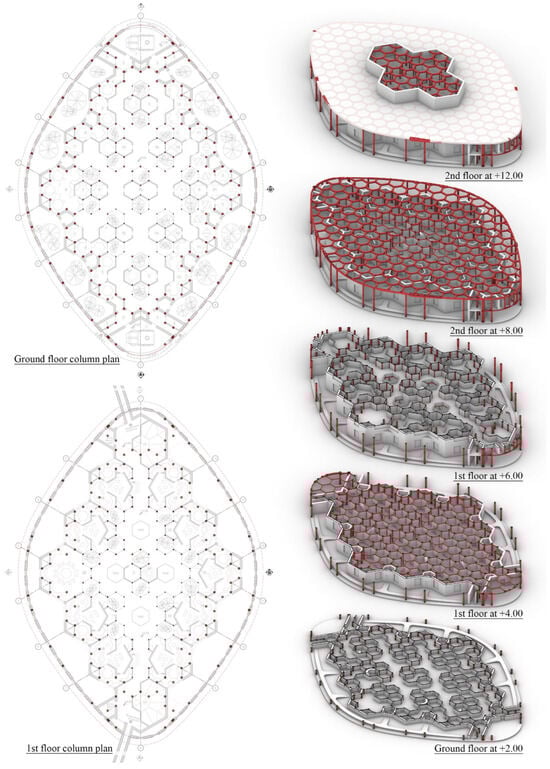 From an architectural perspective, a number of structural considerations are predicted in the initial design. The hexagonal modular pattern, which is used in the 1st step of the design phases, has provided a context in which the distribution of vertical loadings can be possible through different kinds of structural systems. Plus, there are places designed at the end of each axis (i.e., grid) that are designated to situate structural columns.