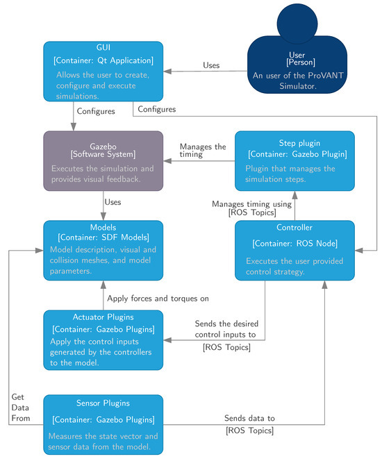 Figure 2 illustrates the internal elements of the ProVANT Simulator, which are represented as containers—modules composed of multiples components. In addition to these software elements, the ProVANT Simulator also includes ready-to-use UAV descriptions, equipped with plugins for state vector measurements and actuator simulation. Figure 2 also highlights the Sensor and Actuator plugin components, which extend Gazebo’s functionalities and provide essential interfaces for developing control strategies.