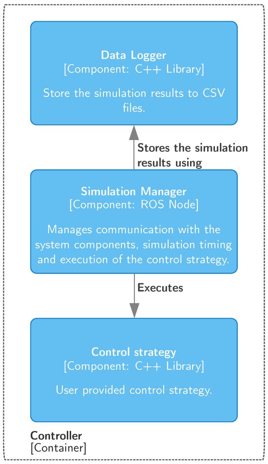 The Controller container encompasses all essential functionalities for communication, storage of the simulation results, timing management, and other requirements for executing the control strategies. Figure 3 presents a detailed view of this container, highlighting the user-provided control strategy (bottom) and the data logger component (top), which records simulation data for future analysis.