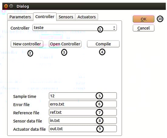 By double-clicking the model entry in the tree structure highlighted in orange (1) (see Figure 5), the Controller tab is opened, as illustrated in Figure 6. Within this tab, users can: (1) select an existing control strategy; (2) create a new one; (3) open and edit an existing strategy; and (4) compile the selected controller. The tab also includes fields to configure (5) the sampling time and to define file paths for (6) tracking error, (7) reference signals, (8) sensor data, and (9) actuator data, facilitating post-analysis of the results. Button (10) confirms and saves the configuration. Still within the Controller tab, users can access the Sensors and Actuators tabs to configure the respective topics. These topics define the ROS interfaces through which the controller will communicate with the simulated system during execution.