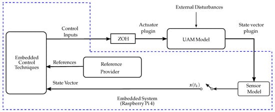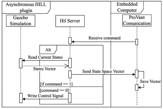 In synchronous HIL mode, which is most appropriate to be used when the embedded system cannot compute the control signal within the system’s sampling time, the simulator assumes the role of master, and the embedded device operates as a slave. As depicted in Figure 8, the HIL plugin initializes a server that transmits the current state vector to the embedded computer and waits for the corresponding control signal. The simulation pauses during this exchange, resuming only after the control signal is received and applied.