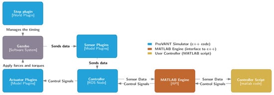 The Step plugin (located at the top-right portion of Figure 2) is a container that replaces the Gazebo’s standard timing management mechanism, allowing the controller to manage simulation timing. This plugin ensures that the simulation advances only after the control strategy has completed all computations for the current step, regardless of the processing time required.