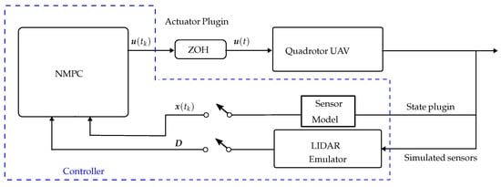 The NMPC was designed to steer the quadrotor from an initial position to a desired target in minimum time while avoiding obstacles. Environment obstacles detected via the emulated LIDAR sensor were represented as polyhedra using a half-space representation. Obstacle-free zones were decomposed into convex subregions, which served to define constraints in the NMPC optimization problem, which aimed to minimize control effort while ensuring the vehicle remained within the feasible regions defined by the sensor data. Figure 10 shows the block diagram of the control system utilized in the SIL experiment. The NMPC control strategy is computationally demanding and does not meet real-time execution requirements. As a result, the simulation is performed in synchronous mode, allowing the control strategy to be tested while deferring computational optimization to future work. No external disturbances were considered in this case study.
