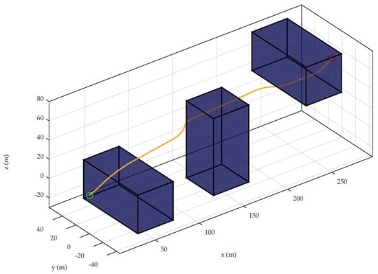 Three-dimensional view of the trajectory (yellow line) traversed by the quadrotor UAV while avoiding three obstacles in an urban-like environment. The green and red circles correspond to the initial position of the quadrotor UAV and the desired target, respectively. This result corresponds to the case study in Section 4.1.