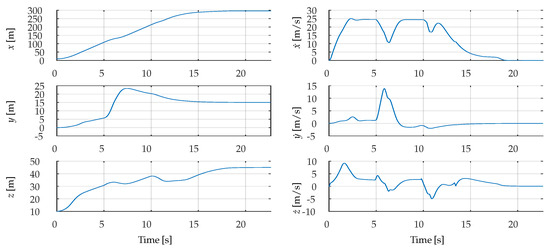 Time evolution of the UAV’s position (x, y, z) and linear velocities (, , ) obtained from the SIL experiment.