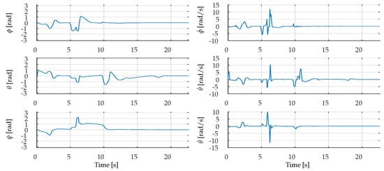 Time evolution of the UAV’s attitude angles roll () pitch () and yaw () expressed in Euler angles using the ZYX convention about local axes, and their time derivatives (, , ) obtained from the SIL experiment.