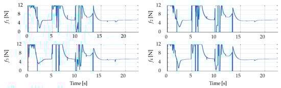 Time evolution of the thrust forces applied to the quadrotor UAV rotors during the SIL experiment.