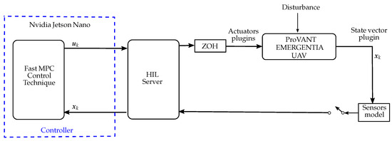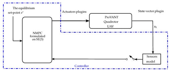 The primary objective of this section is to evaluate NMPC schemes proposed for aggressive motion control of a quadrotor UAV, using SIL experiments conducted in the ProVANT Simulator. The mathematical modeling and the NMPC control design are described in detail in [17]. A block diagram of the implemented control architecture is presented in Figure 15. The UAV parameters are detailed in Table 2.