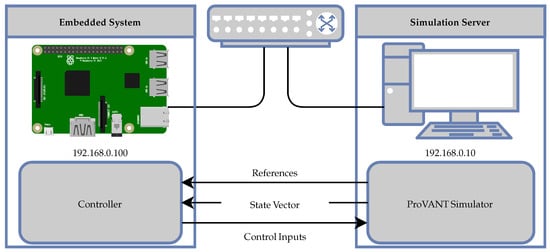 The ProVANT Simulator supports Software-in-the-Loop (SIL) experiments, in which control strategies are executed on a general-purpose computer. This setup is particularly useful during the early stages of development, allowing for debugging and preliminary performance assessment in a controlled environment. However, SIL simulations do not always reflect the constraints of real-world deployment, as there are often significant differences in processing power, memory, and timing behavior between desktop workstations and the embedded platforms used in actual robots. To bridge this gap, the simulator also supports Hardware-in-the-Loop (HIL) experiments, enabling the control software to run directly on the target embedded hardware. This capability enables more accurate performance evaluation under realistic computational conditions, bringing the testing process closer to final deployment.