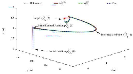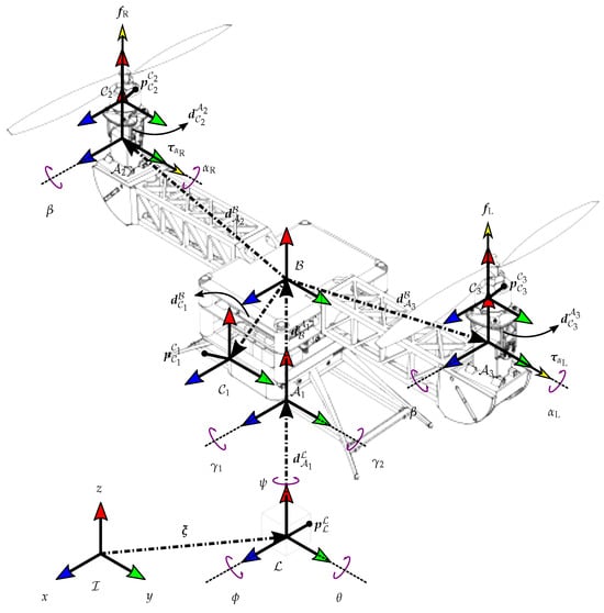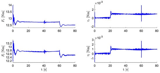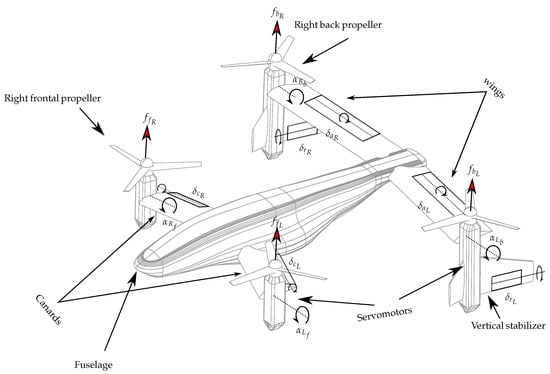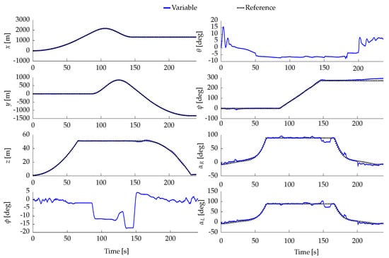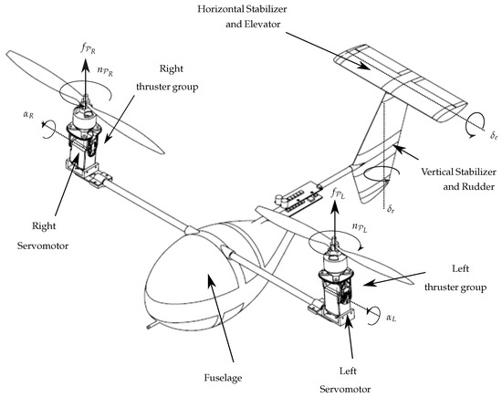 Forces generated by the propellers (, ), torques applied to the thruster assemblies by the servomotors (, ), deflections of the elevator and rudder aerodynamic control surfaces (, ). This result corresponds to the case study in Section 4.5.