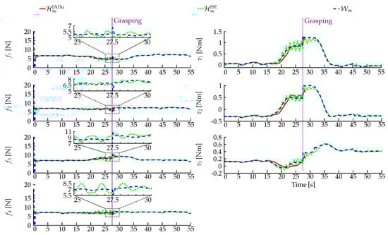 Tilting angles (, , , ) of the right and left servomotors from the frontal and rear parts of the UAV, and torques applied to the thruster assemblies by the servomotors (, , , ), obtained from the HIL experiment. This result corresponds to the case study in Section 4.7.