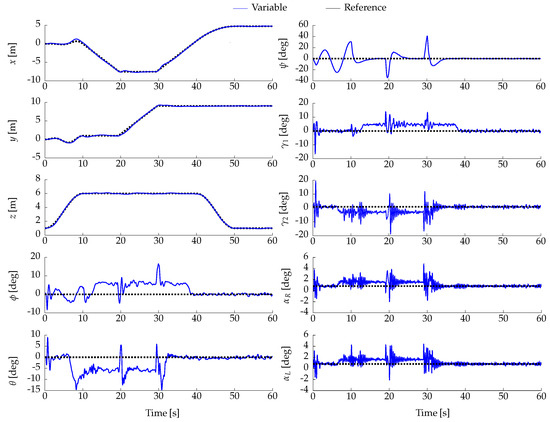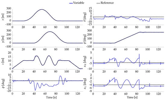 Translational positions (x, y, z), attitude angles roll (), pitch (), and yaw () expressed in Euler angles using the ZYX convention about the local axes, along with the tilting angles (, ) of the right and left servomotors, obtained from the SIL experiment. This result corresponds to the case study in Section 4.6.