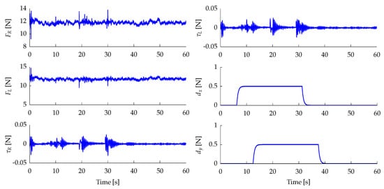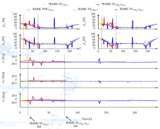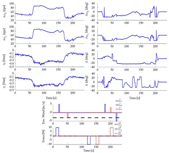 Forces applied by the frontal and rear propellers (, , , ), and deflections of the aerodynamic control surfaces (, , ) obtained from the HIL experiment. This result corresponds to the case study in Section 4.7.