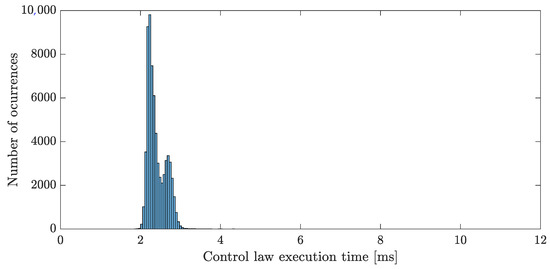 Asynchronous HIL experiments were conducted using the ProVANT Simulator to evaluate the controllers’ real-time performance and assess their readiness for deployment on the physical prototype. The ODE physics engine was chosen in Gazebo to experiment, taking into consideration a time step of 4 ms and a sample time of 12 ms for the controller, the latter representing the system’s real-time constraint. The control algorithm was executed in a Raspberry Pi 4 model B SBS with a quadcore ARM Cortex-A72 processor running at 1.5 GHz, with 8GB of DDR4 RAM and a VideoCore XI GPU (ARM Holdings, Cambridge, UK). The UAV was tasked with tracking the same trajectory addressed in the previous case study. The results of the HIL simulations are illustrated in Figure 50, Figure 51, Figure 52 and Figure 53, and a video of the experiments is available at https://youtu.be/GxHePSJiPKg. A histogram of the execution times for the implemented control strategies is presented in Figure 53. As shown, all strategies successfully met the real-time performance requirement.