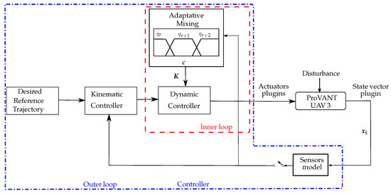 In this case study, the ProVANT Simulator is employed to conduct synchronous SIL experiment evaluating the performance of the Robust Adaptive Mixing Controller (RAMC) proposed in [27]. A comprehensive discussion of the UAV’s mathematical modeling and control design can be found in the same reference. The RAMC controller adopts a cascade structure, with the outer loop responsible for planar motion, governed by the x and y dynamics, and the inner loop handling altitude and attitude control, which includes the dynamics of z, , , , , , , , and the UAV body velocities. The outer loop kinematic controller generates desired linear velocity references, which are then tracked by the inner loop RAMC. A block diagram of the proposed control architecture is shown in Figure 40.
