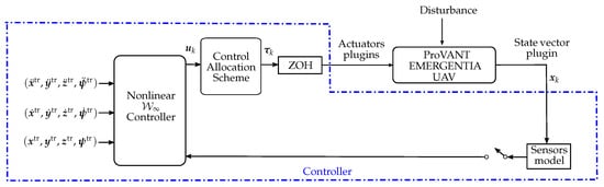 Block diagram illustrating the control strategy implemented via SIL for the ProVANT EMERGENTIA UAV, designed to operate across this UAV’s entire flight envelope [28].