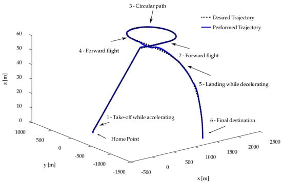 The SIL experiment evaluates the UAV’s ability to follow a predefined trajectory composed of six distinct segments, as detailed in Figure 41. Accordingly, Figure 42 and Figure 43 show the time evolution of the translational position, attitude, tilt angles, applied forces and torques, and the deflections of the aerodynamic control surfaces. A video recording of the simulation is available at https://youtu.be/Lrf-QX34Wnk.