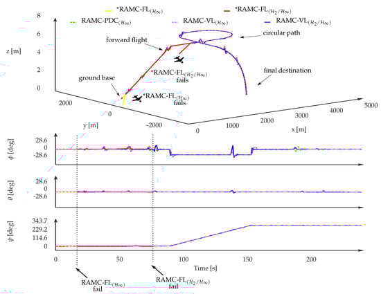 This case study aims to evaluate the stability and trajectory tracking performance of the VERSATILE UAV across its entire flight envelope under external disturbances, using a set of control strategies. To this end, five RAMC controllers, based on the same architecture, presented in Section 4.5 and illustrated in Figure 40, were implemented and tested: , , , , and . Each controller adopts a distinct design methodology to compute the mixing feedback gains used in the adaptive structure of the dynamic controller. A detailed discussion of their theoretical foundations and implementation procedures is provided in [31]. Table 9 presents the VERSATILE UAV parameters.