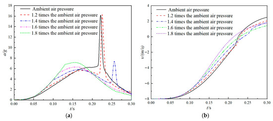 The exhaust pressure of the vent orifice directly influences the maximum pressure of the main airbag and its cushioning performance. For a further analysis of cushioning performance, vent orifice opening pressures of 1, 1.2, 1.4, 1.6, and 1.8 times the ambient pressure were selected. The response results of the airdrop system are shown in Figure 14.