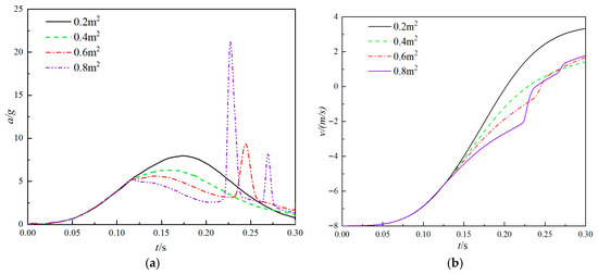 The size of the vent orifice in the new airbag system determines the rate at which gas flows between the main and side airbags. To investigate the effect of the vent orifice area on the cushioning performance, four different total vent hole areas of 0.2 m2, 0.4 m2, 0.6 m2, and 0.8 m2 were selected for comparison. The comparison data are shown in Figure 15.