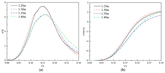 To investigate the effect of the main airbag height on the cushioning performance, four heights of 1.25 m, 1.3 m, 1.35 m, and 1.4 m were selected for comparison. The comparison results are shown in Figure 16.