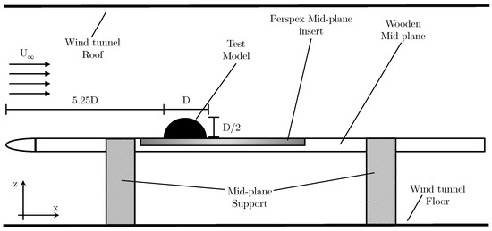 Based on a protuberance flow, the flow around a bluff body is characterised into two distinct regions these being the upstream flow features and the downstream flow features. Some key early work, looking into the flow surrounding such protuberances, was conducted by Savory et al. [1], Baker [2], and Achenbach [3]. As a hemisphere is a simple bluff body, key flow features around a hemisphere include the turbulent wake, flow separation around the structure and generation of vortices in the near field region. A fundamental piece of work regarding flow around a hemisphere arises from Tamai et al. [4] in which analysis of the vortex structures around a hemispheric hump is conducted at varying Reynolds numbers. The key points observed from this testing are the presence of a recirculation zone behind the hemisphere in which arched vortex tubes form and collapse. Furthermore, when modulating the Reynolds number, until the critical Reynolds number is reached, the vortex tubes appear to shed individually from the recirculation zone. Once the critical Reynolds number is exceeded, the vortex tubes begin to coalesce in the recirculation zone, which then proceeds to shed. Savory et al. [1] also clearly note that within the wake, the dominant flow structure is the shedding, specifically von Kármán (vK) vortices, from the body. In particular, Savory et al. [1] also state high sensitivity to the boundary layer (BL) on the formation of the vortex structure; however, for this experiment, the boundary layer was maintained consistently to prevent any further variability. Manhart [5] also corroborates the previous experimental data of Savory et al. [1] by observing similar behaviour when performing a LES analysis of flow around a hemisphere at . The behaviour of the region is from the separation and roll-up of the shear layer at the top of the hemisphere and the separation of the vK vortex structures from the side regions of the hemisphere.