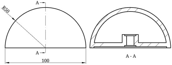 The rigid model is constructed to prevent any structural movement during testing. For this, 3D printing was used. For model generation, a hemispherical shell was designed and 3D printed using standard PLA. The shell thickness used was , selected to minimise material waste during manufacture but maintain structural rigidity at the desired Reynolds number and eliminate structural deformation under high wind loading conditions. An internal cross-shaped core is used to allow mounting to the wind tunnel mid-plane, with the mounting mechanism recessed above the edge of the hemisphere surface to allow flush mounting to the acrylic wind tunnel insert. The rigid hemisphere surface was surface finished with P400 sandpaper and gap filler to smooth the surface of the hemisphere and minimise the effect of the 3D print layers from altering the flow characteristics. Figure 3 presents the rigid hemisphere diagram with a sectional view of the internal structure. Figure 4 presents the rigid hemisphere model.