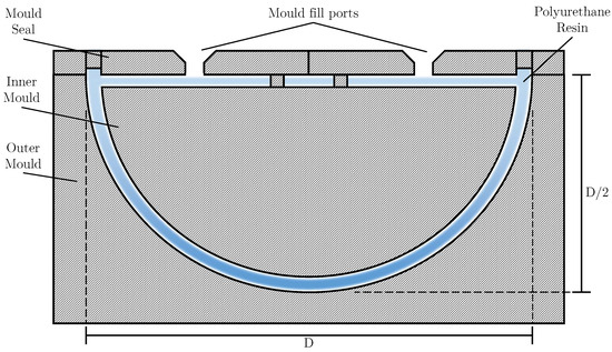 To create the flexible model, a negative mould was created with 3 distinct sections: the outer shell, the inner shell, and the mould seal. The outer shell is a fixed structure, 3D printed, utilising the same techniques as the rigid model. This component is 3D printed using PLA, and the interior is sanded using P400 sandpaper to remove minor surface imperfections from the printing process, as with the rigid model. The outer shell is a rectangular box with a hemisphere indent positioned at the top. The base diameter of the indent is 1D to maintain exterior dimensionality with the rigid model. The depth of the indent is D. This structure provides the shape and size of the exterior surface of the resin mixture. The second segment is the inner mould structure. This structure is again 3D printed with poly-lactic acid (PLA) and sanded. The inner mould section dictates the thickness of the wall itself. For the creation of the A-25 model, the inner mould diameter was set as D. The base of the interior section is also made D shorter than the total height of the model to allow a small edge to be created on the base of the flexible model to allow for the mounting mechanism to be housed and attached without disturbing the exterior shell. Figure 5 shows the general diagram of a negative mould. The shaded regions represent the void in which the PU resin is poured and cured to allow for solidification. The inner mould and the mould seal are attached using 4 bolts, with the joined parts being further bolted to the outer shell, ready for the PU resin to be poured into the cavity. The cavity interior was also coated with a layer of spray-on mould release to aid in removal and cleaned off the surface after manufacture. The resin was allowed to cure at room temperature for 24 h before release from the mould.