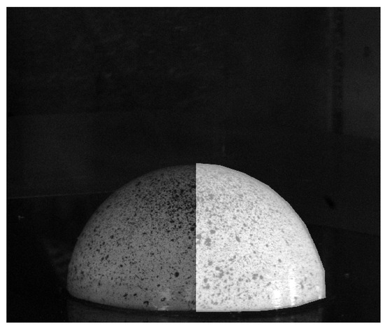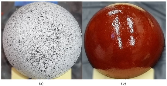 For each experiment conducted, the models require minor surface alterations to enable data acquisition. For the SPIV setup, due to the reflectivity of the surface materials, all models are coated in a rhodamine mixture to mitigate surface reflections, as previously demonstrated by [17]. This mixture, coupled with a filter lens, allows for the minimisation of reflections into the camera field of view (FOV), enabling higher clarity in the final SPIV images. For the DIC implementation, however, the surface of the A-25 model must have high contrast. Note that the rigid model was not tested with DIC due to the absence of any surface deformation. Due to the spherical shape of the models, it was deemed infeasible to cover the structure with a surface film to provide contrast. Thus, the rhodamine mixture was removed post SPIV data acquisition, and the A-25 model was re-coated in a thin layer of white acrylic paint. To maintain an even surface, this was performed in multiple thin layers until the surface was covered in a consistent layer of white paint. Then, a random black speckle pattern was sprayed across the surface of the structure using acrylic black paint to generate the tracking points utilised for DIC tracking of the surface. For the creation of the speckle pattern, recommended good practices were utilised as described by both [18,19]. However, there are levels of variance in the speckle pattern due to inconsistencies in the spraying process in different regions of the model. Figure 6 shows both the A-25 model coated with rhodamine and with the surface pattern for the DIC analysis.