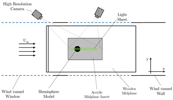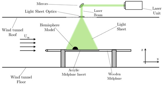 During the testing procedure, the SPIV experiment was conducted initially. A Litron Bernoulli B-PIV 200-15 laser was utilised, with a 15 Hz repetition rate and a wavelength of 523 nm. For data acquisition, the cameras utilised were two LaVision CX-5 cameras, with a resolution of 2440 × 2040 pixels. The cameras are coupled with 30 mm lenses and 523 ± 10 nm filters. The seeding particles used were vaporised Di-ethylhexyl sebacate particles. All image acquisition was conducted using a DaVis system. The major structural deformation, determined observationally from initial pretesting, was along the centreline of the hemisphere structure. Thus, for this testing, a centreline slice within the flow field of the wind tunnel was observed. The pixel resolution for the setup tested was 7.56 pixels/mm. Figure 7 and Figure 8 present diagrams of the test setup used for data acquisition. Image acquisition was completed using a phase-locked system, with an external trigger. This allows for the acquisition of 100 samples at a 5 Hz input pulse, offset with 20 subsamples of the overall 5 Hz pulse. In this paper, the results presented are mean and root mean square (RMS) flow parameters and the specific operational characteristics of the phase locked PIV and development will be presented in a subsequent paper.