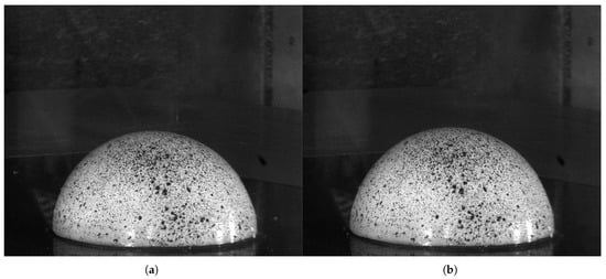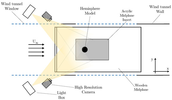 As can be noted from Figure 7, the camera positioning and the general test setup are specifically geared to the SPIV setup, allowing the capture of the surrounding flow region. For the DIC analysis, the primary facet of observation is the structure itself, thus necessitating a differing camera position and angle. For the DIC experiment, the same two LaVision CX-5 cameras are utilised; however, the position has been moved to provide an overlapping FOV across the leading edge (LE) of the hemisphere. To provide additional illumination to the FOV, two light box arrays with four 28W white halogen lamps with a colour temperature of 5000–5500 K were placed external to the wind tunnel. This was added in addition to the LED lights present within the wind tunnel. Figure 9 illustrates a diagram showing the general test setup utilised for the DIC experiment. The FOV for each camera primarily cover the LE region, with the overlapping target area being the LE centreline.