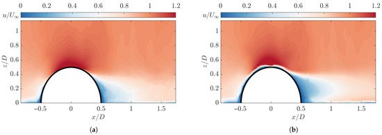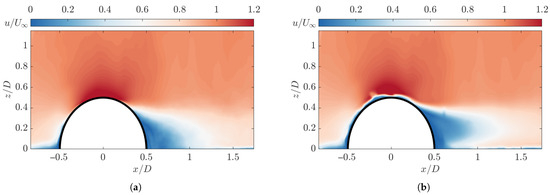 Wood et al. [9,10] have previously shown a comparison between the aero-elastic interactions between both a thin-walled membrane, a rigid structure, and the surrounding flow. Specifically, the structure used during the testing is an air-inflated hemisphere, held at a constant pressure during the testing procedure. Instead, for the experiment conducted within this paper, we observe the free deformation of a structure under oncoming wind loading. In Wood et al. [9], the region of maximum displacement was along the LE of the hemisphere, with maximum displacement approaching the hemisphere apex. The experiment within this paper is conducted without the addition of internal pressurisation; thus, the structure is not expected to deform exactly as shown by Wood et al. [9]. The material stiffness is also expected to cause variation, as stiffness greatly affects the nature of deformation of the structure. Furthermore, Wood et al. [9] perform experimentation in to compared to current tests (). Thus, the variation in Reynolds number may provide a greater variation in behaviour. To highlight, a key feature that was analysed in this test regime is the formation of an elongated ‘belly-shaped’ recirculation region due to the movement of the detachment line on the surface of the flexible model, as described by Wood et al. [9], who also investigate the behaviour using a particle image velocimetry (PIV) set-up, allowing for a direct comparison between the existing literature dataset and the current dataset and further showing the effectiveness of the technique for this application.