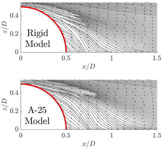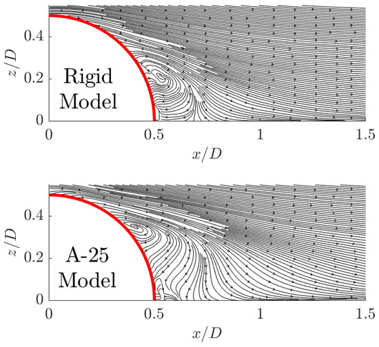 Mean wake flow streamlines (top: rigid) (bottom: A-25).