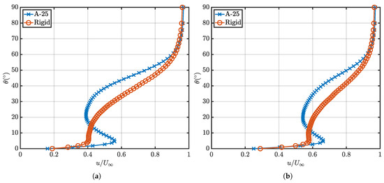 The deformation that was obtained from the experimental analysis is provided as an altitude angle, , along the LE of the hemisphere surface to allow matching of data between the structural deformation and the fluid behaviour. Note, in Figure 14, represents the altitude angle along a spanwise slice across the centreline of the hemisphere, and is the base, while is the apex of the hemisphere. For the fluid behaviour, streamwise samples have been taken within the ROI as indicated in Figure 12 and Figure 13. Taking a sample along the streamwise direction between and , two major variations between the rigid model and the A-25 model can be observed. The first is the large reduction in flow velocity starting at of . The velocity reduction causes an inflection point at for the RMS and for the average, in which the flow decelerates to and , respectively. This is in contrast with the rigid model where, at the same , the velocities are and for the RMS and average, respectively. This shows a velocity reduction of in the RMS of velocity and in the average velocity. This behaviour corresponds to the flow features indicated in Figure 12, in which the vertical movement of the recirculation vortex core causes the localised average velocity reduction. This behaviour is further linked to the upstream deformation of the LE, which is discussed subsequently within this paper.