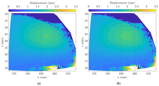 Implementing the DIC algorithm within the ROI on the A-25 model produces the results shown in Figure 17. Due to the resolution of the speckle pattern mentioned previously, at the edge of the ROI, the displacement within the region cannot be resolved and appears as 0 mm displacement. This region is not critical, as the point of maximum deflection coupled with the trend across the LE is observable, allowing direct comparison to be made. The point of maximum deflection is observable, occurring at mm and mm with an average maximum displacement of mm, with an RMS of mm. The region marked by the red boundary indicates the LE region; as the SPIV only analyses the plane down the centreline of the hemisphere, this region is selected for analysis within the DIC results to observe the linkage between the deformation and the wake behaviour. To minimise the random error within the comparison, both RMS and an average of the deformations between the two bounds are taken, indicating a deformation average across a centreline slice of the LE for every given angular position along the hemisphere surface.