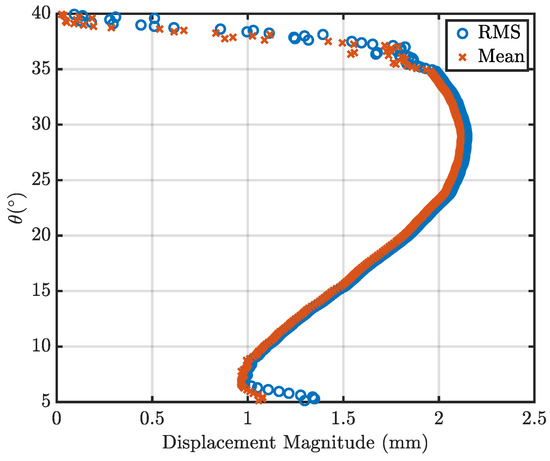 The data extracted from Figure 17 was converted to angular position on the surface of the hemisphere. presented within Figure 18 indicates the angle across the LE. Angles below were observed to have high noise and low correlation due to glare in the image. These regions are not expected to deform due to the presence of the internal mounting plate. Between and , minor deflection is visible, of approximately 1 mm with a linearly increasing trend occurring until , where the region of maximum deflection occurs. Observationally, this region is highlighted by the concave structure, which causes the apparent parabolic curve to extend from to , with the central maxima occurring at for both the RMS and the mean values. The shape of this peak deformation region further confirms a parabolic deformation of the LE structure centred around . When the angle exceeds , the algorithm is not able to resolve the speckle pattern due to the curvature of the structure and the FOV limitation of each camera position. The average peak deformation is mm and the RMS is mm. As can be noted, the maximum observable with the DIC implementation was approximately on the hemisphere surface. Within the entire vertical slice taken, there is some non-zero displacement magnitude, with the minimum true value recorded indicating ≈1 mm of displacement. Therefore, the entire structure is shown to deform, with the localised maxima occurring at the LE.