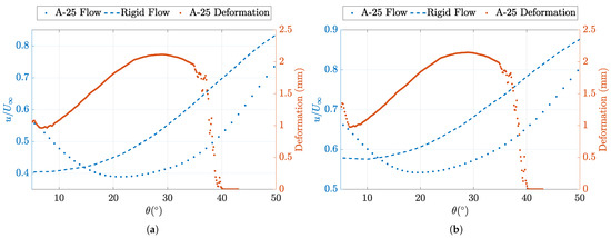 Figure 19 presents the collated data for the deformation and the flow behaviour in the wake region. As noted previously, the deformation of the LE region of the hemisphere shows correlation with the downstream wake velocities, indicating a direct link between the deformation and wake behaviour. As increases past , for the A-25 flexible model converges towards the rigid model behaviour. This occurs as it approaches the structure’s apex. Also of note is the shift of the recirculation core as highlighted in Figure 12, which corresponds with of of the A-25 model.