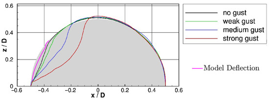 FSI investigates the interaction between the fluid reacting to the structure, and vice versa. The results show that the LE wind loading causes a concavity in the LE region. This is dependent on two critical factors, the Reynolds number of the flow and the structural stiffness of the model. De Nayer et al. [23] investigates the deformation of a flexible membrane with the addition of a gust load at . The deformation of the structure in [23] matches with the position of deformation observed within the experiment. Comparing Figure 17 and Figure 18, the major location of deformation is consistent with the numerical analysis of the deformation for the no-gust case, as indicated in Figure 20. The region of deformation is between 0 and 0.3, which corresponds to the region bounded by and , as presented within this paper. The magnitude variation between the literature and the current experiment is primarily linked with the structural stiffness variations between the current experimental model and the numerical model used in [23].