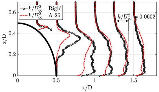 Figure 12 indicates the RMS of the wake flow within the ROI; of particular note is the similarity between both the rigid and A-25 models in general shape. The major variation observable is the increase in the streamwise () dimension of the A-25 model’s recirculation region.