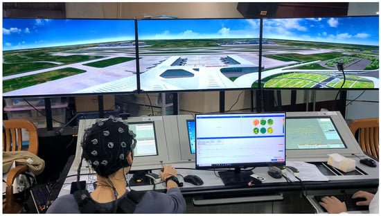 The virtual setting, referred to as “Hansa Airport”, was constructed based on the layouts and operational characteristics of Wuhan Tianhe (ZHHH) and Changsha Huanghua (ZGHA) international airports, aiming to reflect realistic apron control dynamics. Scenarios included complete sequences of aircraft movement such as arrival, taxiing, gate assignment, and departure scheduling. To maintain consistent task demands across the low-traffic and high-traffic conditions, a fixed traffic schedule was employed. Several pre-experiment trial runs were conducted to confirm the consistency and reliability of the scenario timing and structure. The overall setup of the simulated remote tower control environment and the EEG acquisition procedure is illustrated in Figure 1.