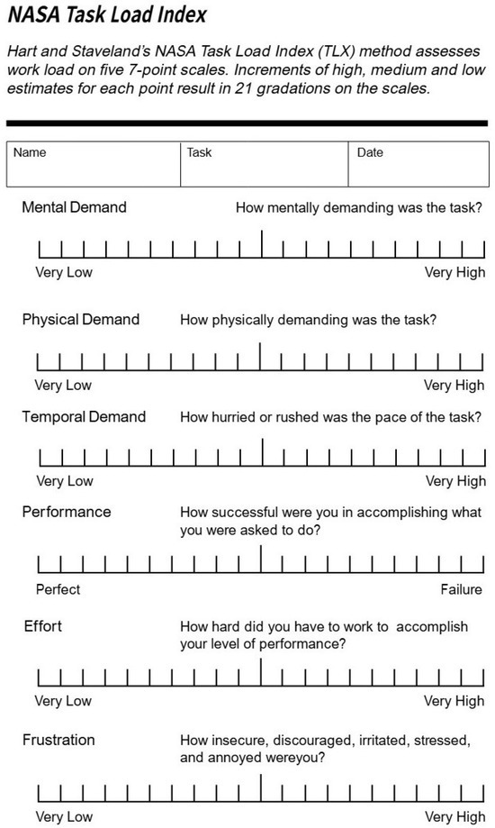 - Hart, S.G.; Staveland, L.E. Development of NASA-TLX (Task Load Index): Results of empirical and theoretical research. In Advances in Psychology; North-Holland: Amsterdam, The Netherlands, 1988; Volume 52, pp. 139–183. [Google Scholar]