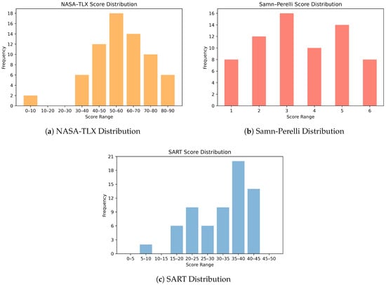 Score distributions of the three subjective scales used for fatigue labeling: (a) NASA–TLX, (b) Samn–Perelli, and (c) SART. Orange, red, and blue bars correspond to the respective scales in subfigures (a–c).