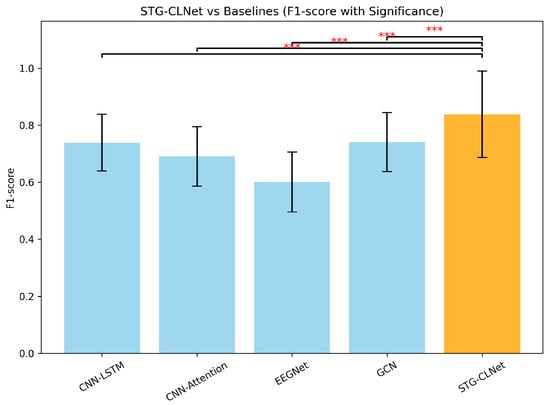 F1-score comparison between STG-CLNet and baseline models with statistical significance. Blue bars represent baseline models, and the orange bar represents the proposed STG-CLNet. Error bars indicate standard deviation across participants. All comparisons between STG-CLNet and baseline models reached statistical significance (*** p < 0.001).